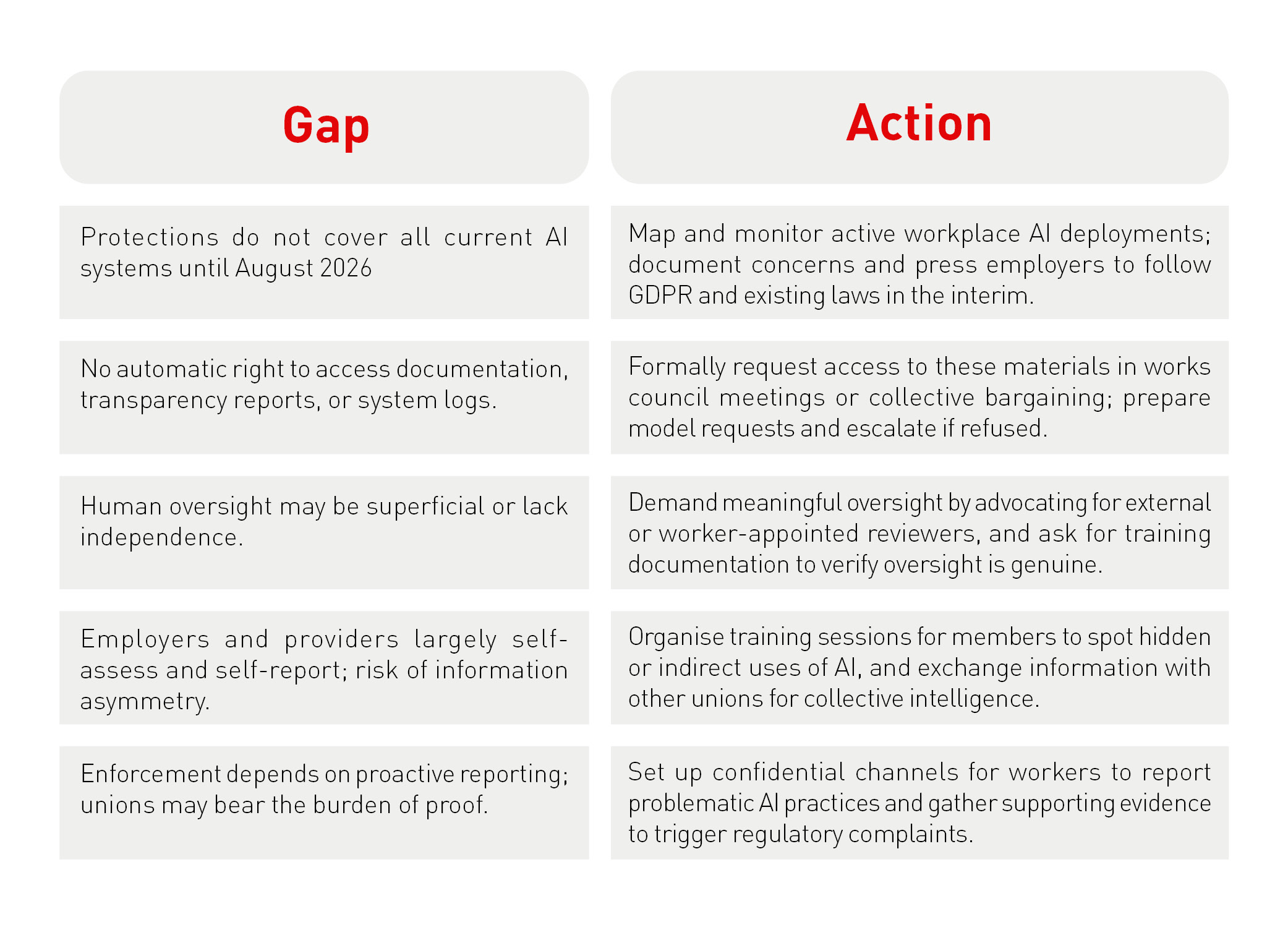 Despite the promise of robust protections in the EU AI Act, significant gaps remain. The Act offers unions new leverage to address algorithmic management, but its safeguards are not automatic or all-encompassing, and many protections take effect only in the future. This tension between promise and reality sets the stage: unions gain powerful legal tools, but the burden remains on representatives to secure real workplace change. Effective enforcement will depend on how unions use these provisions and how employers comply. To help union members feel both warned and empowered, it is important to pair each limitation of the Act with a practical, immediate organising step.